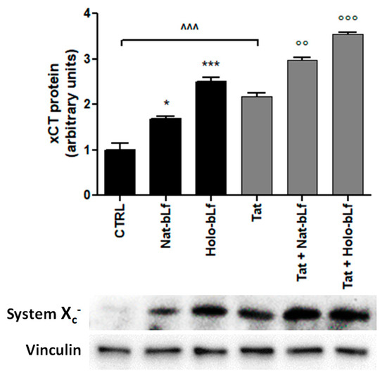 Western blot and densitometric analysis of System Xc− in U373 and U373-Tat cells treated with 100 μg/mL of Nat-bLf or Holo-bLf after 24 h. Data are calculated relative to the internal housekeeping gene (Vinculin) and are expressed as the means ± SEM. One-way ANOVA, followed by Tukey’s test, was used to determine significant differences. * p ≤ 0.05 and *** p ≤ 0.001 vs. CTRL; °° p ≤ 0.01 and °°° p ≤ 0.001 vs. Tat; ^^^ p ≤ 0.001 between Tat and CTRL.