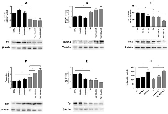 Western blot and densitometric analysis of Ftn (A), NCOA4 (B), TfR1 (C), Fpn (D), Cp (E), and ELISA quantification of IL-6 (F) in U373 and U373-Tat cells treated with 100 μg/mL of Nat-bLf or Holo-bLf for 48 h. Data are calculated relative to the internal housekeeping gene (β-Actin or Vinculin) and are expressed as the means ± SEM. One-way ANOVA, followed by Tukey’s test, was used to determine significant differences. * p ≤ 0.05 vs. CTRL; ° p ≤ 0.05, °° p ≤ 0.01 and °°° p ≤ 0.001 vs. Tat; ^ p ≤ 0.05 between Tat and CTRL.