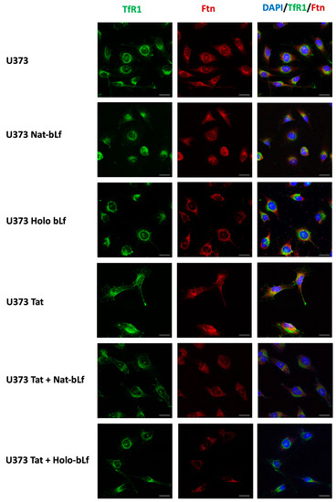 Immunofluorescence and confocal analysis for TfR1 (green) and Ftn (red) subcellular localization in U373 and U373-Tat cells treated with 100 μg/mL of Nat-bLf or Holo-bLf for 48 h. DAPI was used to stain nuclei (blue). Scale bar, 10 μm.