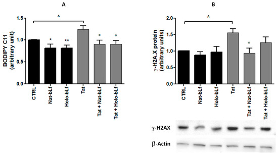 Consistent with the BODIPY analysis, a significant increase in histone variant γ-H2AX, a selective marker of DNA damage, was recorded in Tat-expressing cells (Figure 7B). Again, bLf reverted Tat-induced up-regulation of γ-H2AX, thus suggesting a potential protective effect on DNA damage.