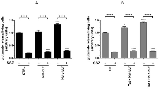 Measurement of glutamate release in co-culture supernatants of SH-SY5Y with U373 (A) or U373-Tat (B) cells untreated or treated with 300 μM sulfasalazine and 100 μg/mL Nat- or Holo-bLf for 24 h. One-way ANOVA, followed by Tukey’s test, was used to determine significant differences. **** p ≤ 0.0001 vs. CTRL; ° p ≤ 0.05 and °°°° p ≤ 0.0001 vs. Tat; ++++ p ≤ 0.0001 between treatment with or without SSZ.