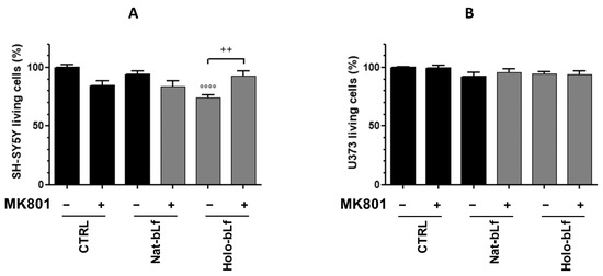 Cell viability measurement by MTT assay on SH-SY5Y cells (A) and U373-Tat cells (B) in co-cultures, untreated or treated with 10 μM MK801 and 100 μg/mL Nat- or Holo-bLf for 24 h. The histograms show the percentage of living cells, and the rate of reduction was calculated by setting the control (CTRL) equal to 100%. One-way ANOVA, followed by Tukey’s test, was used to determine significant differences. °°°° p ≤ 0.0001 vs. CTRL; ++ p ≤ 0.01 between treatment with or without MK801.