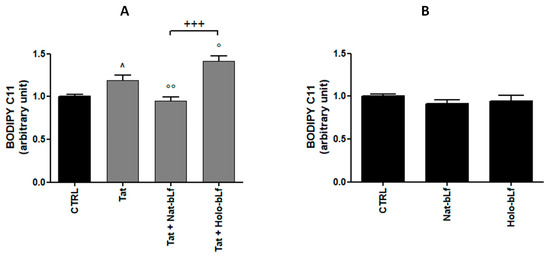 Analysis of lipid peroxidation by BODIPY assay in co-cultures of SH-SY5Y with U373-Tat cells (A) or in SH-SY5Y monocultures (B) untreated or treated with 100 μg/mL Nat- or Holo-bLf for 24 h. One-way ANOVA, followed by Tukey’s test, was used to determine significant differences. ° p ≤ 0.05 and °° p ≤ 0.01 vs. Tat; ^ p ≤ 0.05 between Tat and CTRL; +++ p ≤ 0.001 between treatment with Nat- and Holo-bLf.
