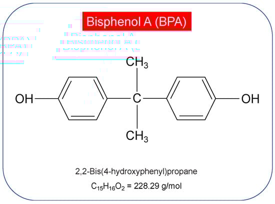 Bisphenol A (BPA) was first synthesized in 1891 by the Russian chemist Aleksandr Pavlovich Dianin; BPA was originally named ‘Dianin’ compound []. Dianin’s method for preparing BPA [2,2-Bis (4-hydroxyphenyl) propane, C15H16O2 = 228.29 g/mol] involved catalyzed condensation of a 2:1 mixture of phenol and acetone in the presence of concentrated hydrochloric acid or sulfuric acid []. BPA is a colorless, odorless, and solid organic compound, poorly soluble in water, and completely soluble in organic solvents (Figure 1) [,]. In the 1950s, it was discovered that reaction of BPA with phosgene (carbonyl chloride, COCl2) produces a clear hard resin, known as polycarbonate [,]. Following this discovery, BPA has been increasingly used in a myriad of industrial and consumer applications [,,]. BPA is a high-production-volume chemical with numerous utilities [,]. BPA is extensively used in the manufacture of polycarbonate plastics and epoxy resins [,,]. Polycarbonate plastics made from BPA have remarkable chemical and physical properties, including excellent strength and rigidity, thermal stability, and resistance to oils and acids [,,]. The epoxy resin of BPA has a viscous consistency, provides strong adhesion and high corrosion resistance, and is commonly used for the coating and inner lining of other products [,,]. BPA monomer is also used in the manufacture of specialty plastics, such as polyester, polysulfone, polyacrylate, and polyetherimide, and as a precursor, developer, additive, or processing aid in the synthesis of other materials [,,,].