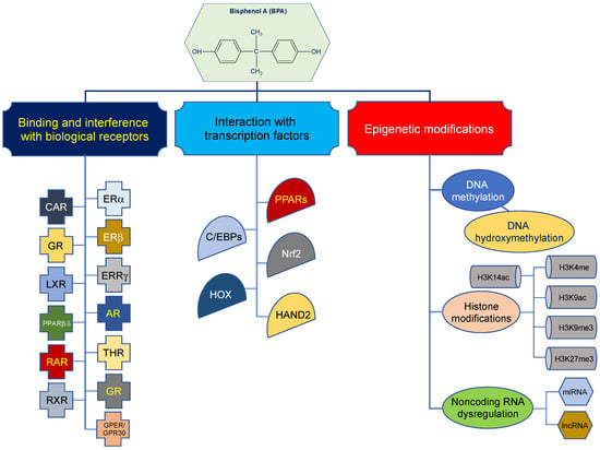 Molecular mechanisms of action of bisphenol A. The mechanisms of action of BPA are depicted, including (1) binding and interference with biological receptors, (2) interaction with transcription factors, and (3) epigenetic modifications. For brevity, the most investigated biological receptors, transcription factors, and histone modifications are shown. The figure is a simplified summary but not an exhaustive delineation of the molecular mechanisms of bisphenol A. AR = androgen receptor; CAR = constitutive androstane receptor; C/EBPs = CCAAT-enhancer-binding proteins; ERs = estrogen receptors; ERRγ = estrogen-related receptor γ; GPER/GPR30 = G-protein coupled estrogen receptor; GR = glucocorticoid receptor; H3K4me = histone 3 lysine 4 methylation; H3K9ac = histone 3 lysine 9 acetylation; H3K9me3 = histone 3 lysine 9 trimethylation; H3K27me3 = histone 3 lysine 27 trimethylation; H3K14ac = histone 3 lysine 14 acetylation; HAND2 = heart- and neural crest derivatives-expressed protein 2; HOX = homeobox gene family; LXR = liver X receptor; Nrf2 = nuclear factor erythroid 2-related factor 2; PARs = peroxisome proliferator-activated receptors; PPARβ/δ = peroxisome proliferator-activated receptor β/δ; RAR = retinoic acid receptor; RXR = retinoid X receptor; THR = thyroid hormone receptor.