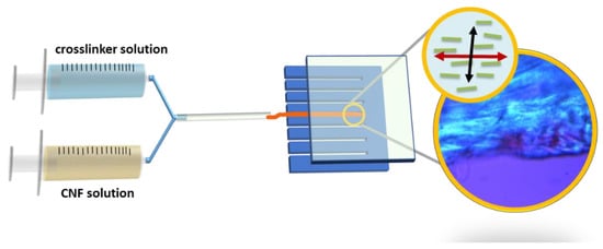 Schematic diagram of the preparation of the anisotropic-structured hydrogel via shear force using co-injection of CNF and crosslinker solutions.