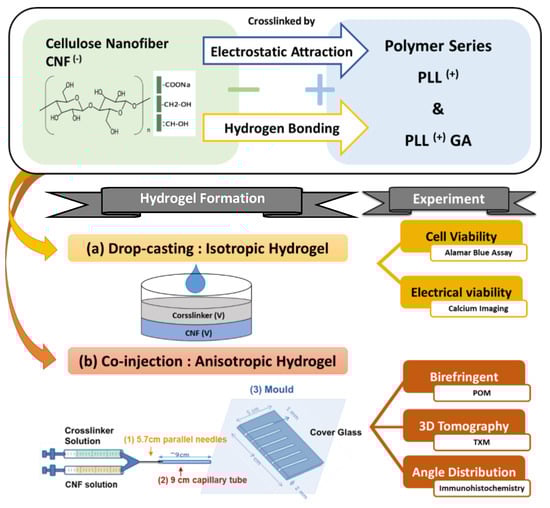 The CNF has to be well dispersed without any aggregation in solution using ultrasonic oscillator before crosslinking with polypeptide. Isotropic hydrogels were fabricated by drop-casting a mixture of equal volume of crosslinker solution (concentration ranged from 6.25–50 mM PLL, PLLGA or Ca2+) and CNF solution (~1.5 wt%), as shown in Figure 2a. After 24 h of aging, isotropic hydrogels were then prepared. Similar solution concentrations were used for anisotropic hydrogel preparation. The anisotropic hydrogel was placed in the capillary tube for 30 min in order to prevent chain relaxation before crosslinked. While anisotropic hydrogels were prepared by co-injecting the crosslinker solution and CNF solution through the applicator tip, dual cannula (SA-3605, FibriJet, Micromedics, Ventura, CA, USA), and gelled in the capillary tube (34507, Kimble, Vineland, NJ, USA), which was connected at the front end of the co-injector, as shown in Figure 2b. Aligned hydrogels were placed in a mold, then soaked in DI water to avoid water evaporation, preventing changes in the swelling ratio of hydrogels.