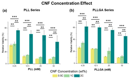 The CNF concentration effect in (a) PLL and (b) PLLGA crosslinker series on the relative viability from AlamarBlue assay on Day 6 PC12 cells. n = 7. The Kruskal–Wallis H-test was used to determine significant differences between groups. (** = p < 0.01, *** = p < 0.001).