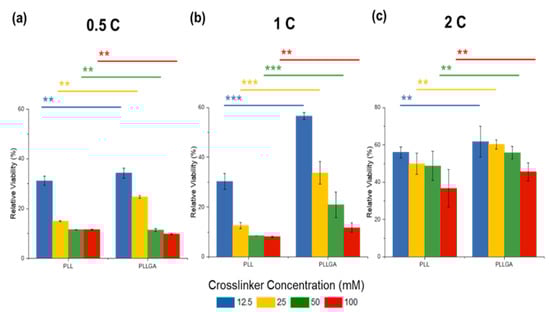 However, the negative impact of PLL crosslinker can be offset and cell viability improves when CNF solution concentration is increased to 2C. Previous studies report that glutamate, an endogenous peptide that acts as an excitatory neurotransmitter, can promote not only cell viability, but also neural function [17,53]. To address potential cytotoxicity, PLL was modified by copolymerizing 20 mol% L-glutamic acid to L-lysine to obtain PLLGA (Figure 4b). Of note, this addition of L-glutamic acid reduces the positive charge of L-lysine accordingly. Thus, the actual crosslinker molar concentration of PLLGA was higher than the equivalent molar concentration of the crosslink sites. Despite the higher actual crosslinker molar concentration of PLLGA, we observed increased cell viability at equivalent crosslink sites (Figure 5). Significant differences in viability reduction were seen between PLL and PLLGA under the same effective concentration (p < 0.001). Therefore, the modification of PLL by glutamic acid (PLLGA) was an effective method to increase cell viability when using poly-L-lysine-based crosslinkers. Next, in vitro experiments were performed using the optimized 2C-6.25PLL and 2C-6.25PLLGA to represent the PLL series and PLLGA series, respectively.