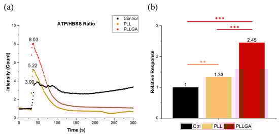 (a) The fluorescent intensity profile of the calcium indicator to ATP stimulation and (b) the electroactivity of ARPE cultured on 2C-6.25PLL and 2C-PLLGA on Day 1 was represented as the response peak heights which were normalized with the control group. n = 7. The Kruskal–Wallis H-test was used to determine significant differences between groups. (** = p < 0.01, *** = p < 0.001). The star sign marks the highest point of each curve.