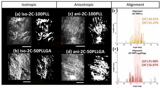 The TXM image of (a) iso-2C-50PLL, (b) iso-2C-50PLLGA, (c) ani-2C-50PLL, and (d) ani-2C-50PLLGA, and the alignment of hydrogel molecules was performed by angle distribution analysis from (e) ani-2C-50PLL and (f) ani-2C-50PLLGA. (n = 50), scale bar 5 micron.