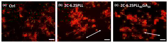 On Day 5 after seeding, the cytoskeleton of PC12 cells stimulated with 2.5s-NGF was stained to investigate whether anisotropic hydrogels could successfully guide neurites growth with specific directionality as shown in Figure 9. Nerve growth and differentiation were determined by measuring neurite length distribution, as shown in Figure 10a. Neurite length distribution presented a positive Skew distribution, which was consistent with the distribution of normal nerve growth [38]. The average neurites length on the coverslip was 59.62 μm, while the ani-2C-6.25PLL and ani-2C-6.25PLLGA can reach 59.38 μm and 69.37 μm, respectively, as shown in Figure 10b. A 16% increase in neurite length is achieved using ani-2C-6.25PLLGA hydrogel scaffold. Typically, cells have difficulty adhering and growing on soft material substrates [70]. Here, neurites differentiation upon ani-2C-6.25PLL is comparable with growth on the coverslip control group. One explanation for this is that the high mechanical properties of the peptide-crosslinker-based hydrogels enhance cellular adhesion [45]. Another rationale is that the lysine in PLL mimics the endogenous neuroprotective role in the CNS [71,72,73]. Regardless, the addition of the 20 mol% glutamic acid significantly increased neurite length, presumably due to stimulation by glutamate, a neurotransmitter used by various neurobiological systems including the neural retina [74]. The results of our neuronal cell differentiation study corroborate the results of this study’s calcium signal imaging (Figure 6). The low doses of polypeptide crosslinkers effectively promoted the electroactivity and differentiation performance in cultured neuronal cell lines. Among them, the 2C-6.25 PLLGA with 20 mol% glutamic acid copolymerized with lysine exhibits significant and outstanding performance.
