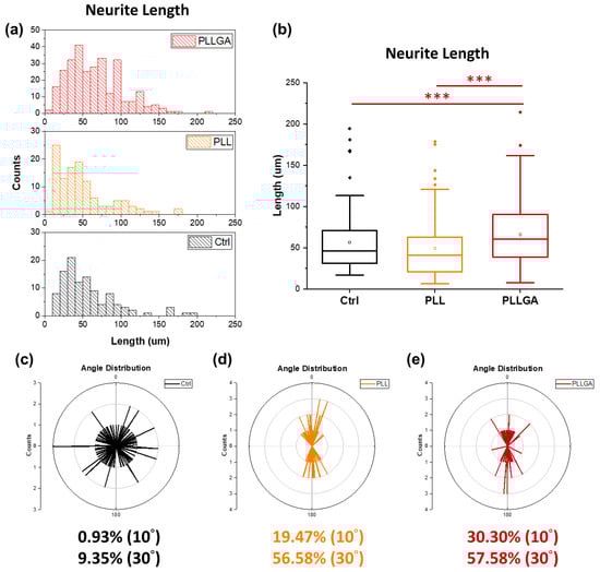 (a) The neurite length distribution and (b) the box chart of the neurite length. The % alignment of (c) control group, (d) ani-2C-6.25PLL, (e) ani 2C-6.25PLLGA. The counts (x-axis) represent the “number of the neurites”. Additionally, 10 degrees represent neurite growth between +10 degree and −10 degree. The Kruskal–Wallis H-test was used to determine significant differences between groups. (*** = p < 0.001).