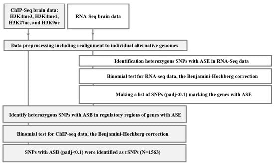 Given the publicly available sequencing data, we have identified 1563 rSNPs associated with both allele-specific binding and expression within ±1000 bp from the TSSs (transcription start sites) or, in total, 1286 known human genes, as well as representatives for the promoter regions. Supplementary Table S1 outlines the complete list. We noted that some rSNPs are linked to the allele specific expression of more than one target gene; the variants that were not assigned an identification tag via NCBI were excluded from further analysis. The input was H3K4me3, H3K4me1, H3K27ac, and H3K9ac profiling data (ChIP-seq) and transcriptomes (RNA-seq) obtained with the same samples from the lateral temporal lobe of 12 AD patients and 18 controls of matched age by Nativio et al. (see Section 4 for details). Figure 1 shows the main stages in the used bioinformatics algorithm.