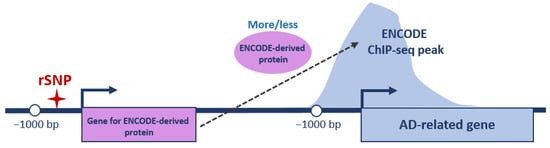 With this in mind, we first overlapped the promoters of 855 AD-related genes with ENCODE 3 ChIP-seq tracks available for 340 DNA and chromatin binding proteins in 129 cell types in hg38 as of October 2022 [85]. Some proteins contained a DNA binding domain and could directly bind to specific short DNA motifs (mainly transcription factors); others bound to DNA indirectly through interactions with DNA-bound transcription factors. If an ENCODE ChIP-seq peak for specific (ENCODE-derived) protein was located within the promoter of AD-related gene, we checked whether any rSNP was located within the promoter of the gene coding for this protein (Figure 3).