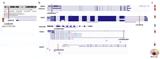 Summing up, in Section 2.2 we gave a description of seven epigenetic regulators which are harboring rSNPs in their promoters, deregulated in AD, and likely involved in pathogenic mechanisms. Here we identified 11 more genes (with a total of 15 more rSNPs in their promoters) that may add to epigenetic panorama in AD. The data suggest the crosstalk between the genes (and their protein products) deregulated in the temporal lobe of AD subjects with the applicability to AD pathogenesis. Thus, ARID1B, a component of SWI/SNF chromatin-remodeling complex, was reportedly a plausible candidate with the transcription upregulated in the temporal lobe in AD subjects [32], presumably because of the allele-specific effects of the rs2281391 variant, which we identified in the ARID1B promoter region (Figure 4a). The ChIP-seq peaks for the ARID1B protein are located within the promoters of another six AD-related genes, including the genes coding for well-described transcription factors (DP2 and ZBED6) and epigenetic regulator DAXX (Figure 4b). The expression of five of the six ARID1B targets was upregulated in the AD subjects when compared to controls (Figure 4c). As is known, SWI/SNF complexes generate and maintain the chromatin accessibility through loosening the histone-to-chromatin binding [91]. Accordingly, the presence of ARID1B in the promoter regions of target genes agrees with the reported upregulation of ZBED, ZC3H11A, AGAP1, TFDP2, and DAXX. In contrast, the HSD17B8 expression was downregulated in the temporal lobe in AD, which suggests a more intricate network of transcription regulation. Correspondingly, we have identified rSNPs that may also contribute to the transcription profiles in the promoters of all ARID1B targets (Figure 4b).
