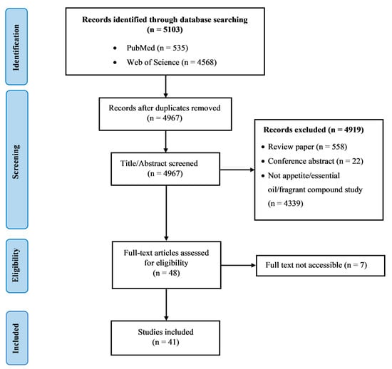 Nguyen, N.P.K.; Tran, K.N.; Nguyen, L.T.H.; Shin, H.-M.; Yang, I.-J. Effects of Essential Oils and Fragrant Compounds on Appetite: A Systematic Review. Int. J. Mol. Sci. 2023, 24, 7962. https://doi.org/10.3390/ijms24097962