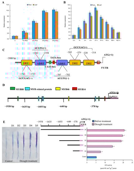 4.3. Expression Analysis of TaPYL5 upon Drought and Characterization of Cis-Acting Regulatory Elements in the TaPYL5 Promoter