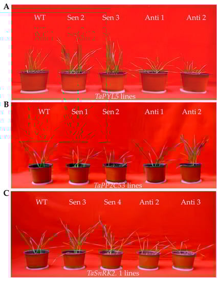 2.5. Transgenic Lines of Genes Encoding TaPYL5 and Its Downstream Partners Modify Plant Drought Response