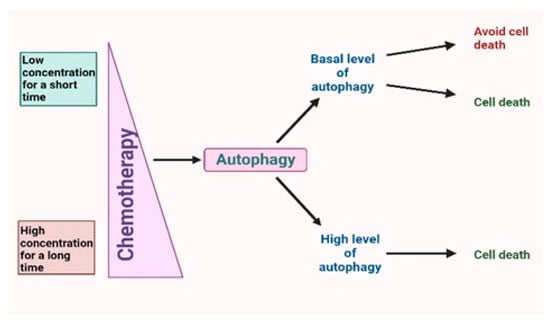 Chemotherapy leads to activation of autophagy, which can be divided into basal autophagy flax and high autophagy flax. Depending on the tumor type and stage basal level, autophagy can induce both cell death and, in most cases, resistance to anticancer drugs. In contrast, a time-dependent overexpression of autophagy caused by a high concentration of chemotherapy drugs leads mostly to cell death and tumor suppression. Thus, concentration and time of action of the drug can regulate autophagy flax.