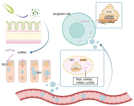 - Chen, Q.; Zhang, F.; Dong, L.; Wu, H.; Xu, J.; Li, H.; Wang, J.; Zhou, Z.; Liu, C.; Wang, Y.; et al. SIDT1-dependent absorption in the stomach mediates host uptake of dietary and orally administered microRNAs. Cell Res. 2021, 31, 247–258. [Google Scholar] [CrossRef] [PubMed]
