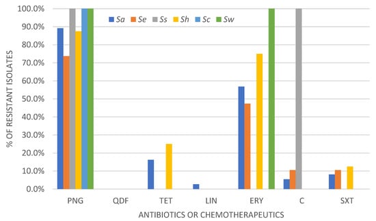 Species-dependent resistance of all tested Staphylococcus spp. isolates selected from nasopharyngeal microbiota of pregnant women to individual antibiotics/chemotherapeutics on the basis of the disc-diffusion method. Abbreviations: Sa—Staphylococcus aureus (n = 37); Se—Staphylococcus epidermidis (n = 19); Ss—Staphylococcus saprophyticus (n = 1); Sh—Staphylococcus hominis (n = 8); Sc—Staphylococcus capitis (n = 2); Sw—Staphylococcus warneri (n = 1); PNG—benzylopenicillin (1 U); QDF—quinupristin-dalfopristin (15 µg); TET—tetracycline (30 µg); LIN—linezolid (10 µg); ERY—erythromycin (15 µg); C—chloramphenicol (30 µg); SXT—trimethoprim-sulfamethoxazole (1.25 µg–23.75 µg).