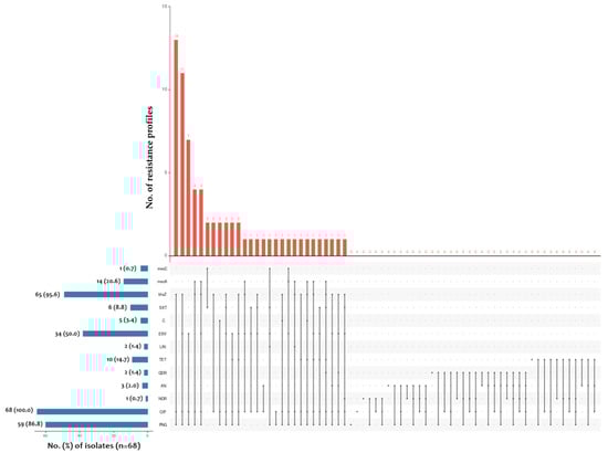 An UpSet plot was constructed to show the antimicrobial resistance pattern of all staphylococcal isolates using online tools (https://asntech.shinyapps.io/intervene/ (accessed 2 February 2023)). An UpSet plot showed the number of shared phenotypes with gene hits that were found in each isolate. In the binary input file, each column represented a set, and each row represented an element. If a name was in the set, it was represented as a 1; otherwise, it was represented as a 0, based on the manufacturer’s instructions.