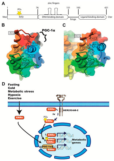 ERRα’s structure and function. (A) The general domain topology of ERRα and other estrogen-related receptors (NR3) includes an amino-terminal domain (NTD), a DNA binding domain, a hinge, and a putative ligand-binding domain (LBD). (B,C) ERRα’s LBD has been crystalized in the absence (B) and presence of ligand (C). The binding site is lined by residues F232, F286, F399 and F414 (PDBIDs 1XB7 and 2PJL) providing bulky side chains that fill the ligand-binding pocket in the absence of ligand (B). Moreover, without ligand, helix 11 (H11) lifts away from the binding site; helix 12 (H12) is perpendicular to H11 and residue F414 occludes the binding site (B). (D) ERRα can bind DNA as a (i) monomer or (ii) dimer. ERRα’s transcriptional activity increases in complex with co-activators, for example PGC-1 α or β (iii), and through posttranslational modifications, such as phosphorylation (iv), mediated by HER2-EGF. ERRα activity increases in metabolic stress, cold, fasting/nutrient deprivation, exercise and hypoxia.