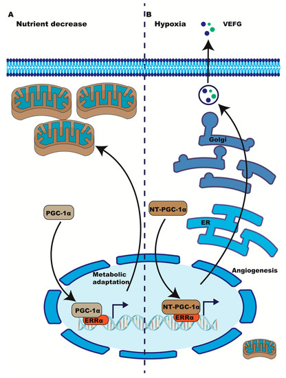 Metabolic adaptation via ERRα/PGC1α in normoxia (A) vs. hypoxia (B). (A) In normoxic nutrient deprivation, ERRα/PGC1α activate mitochondrial biogenesis. (B) In hypoxia, PGC-1α’s truncated isoform NT-PGC-1α binds ERRα but prevents the engagement of other transcription factors, limiting mitochondrial biogenesis and favoring the expression of angiogenesis genes such as VEGF. Oxygen consumption by mitochondria favors local hypoxia with concomitant HIF-1α stabilization.
