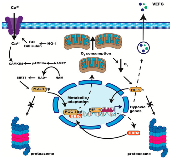 Studies with astrocytes treated with CORM2, a CO-releasing compound that imitates ischemic brain injury, showed that ERRα/PGG1α can increase VEGF expression independent of HIF-1 (that is, even in HIF-1α-deficient cells) [67]. The treatment induces Heme Oxygenase-1 (HO-1) expression and its metabolites (CO and bilirubin) and promotes Ca2+ influx through L-type Ca2+ channels producing CaMKKβ-mediated AMPKα activation [67]. AMPKα increases NAMPT expression and NAD+ synthesis, which in turn increases SIRT activity. PGC-1α can be deacetylated by SIRT1 [67], and once deacetylated it interacts with ERRα to increase mitochondrial biogenesis and oxygen consumption [67] (Figure 3). With this model, the authors previously suggested that oxygen consumption aggravates intracellular hypoxia, allowing HIF-1α stabilization that further increases ERRα/PGG1α expression [60]. Using ChIP assays, the authors proposed that HIF-1 can stimulate ERRα’s transcription by binding to putative HIF-1 response elements (+539 to +542, 5′-CGTG-3′) within the promoter region of the ERRα gene [60]. HIF-1α knockdown blocked ERRα’s expression but not PGG1α’s in that HO-1 inducing model. Therefore, it is likely that HO-1 can stimulate VEGF both via HIF1-α dependent and independent mechanisms, the latter involving PGC-1α/ERRα and calcium regulation through the Ca2+/CaMKK/AMPK pathway [67] (Figure 3). These authors also propose some reciprocal and dynamic coordination between HIF-1α, and PGC-1α/ERRα for VEGF expression in astrocytic ischemia, involving mitochondrial biogenesis [60].