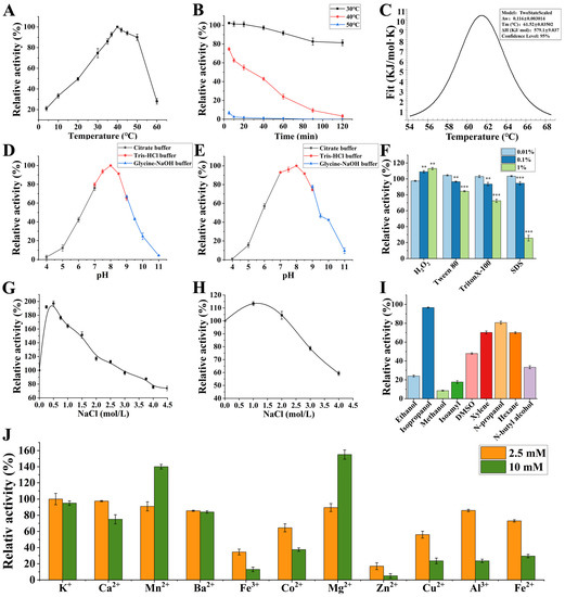 Enzymatic properties of EK4-1. (A) Optimal activity temperature: the temperature profile of protease EK4-1 activity was measured in 20 mM Tris-HCl buffer (pH 8.0) in the range of 4 °C to 60 °C for 10 min. The highest enzyme activity was set to 100%. (B) Thermal stability: protease EK4-1 was pre-incubated at temperatures ranging from 30 °C to 50 °C for 120 min, and then the residual activity of protease EK4-1 was determined in 20 mM Tris-HCl buffer (pH 8.0). The non-heated enzymes were taken as being 100%. (C) Tm value of EK4-1. (D) Optimal pH: the protease reaction was performed in 20 mM citrate buffer (pH 4.0–7.0), Tris-HCl buffer (pH 7.0–9.0) and glycine buffer (pH 9.0–11.0) at 40 °C for 10 min and determined using the folinphenol method. (E) pH stability: protease EK4-1 was diluted into buffers which were 20 mM citrate buffer (pH 4.0–7.0), Tris-HCl buffer (pH 7.0–9.0) and glycine buffer (pH 9.0–11.0) and stored at 4 °C for 24 h; then, the residual activity was measured. In (D,E), the highest enzyme activity was set to 100%. (F) Effects of oxidants and surfactants: protease EK4-1 was diluted into oxidants and surfactants at 4 °C for 30 min and then the residual activity was determined. The untreated enzyme was used as a control (100%). (G) Effects of NaCl concentration on EK4-1. The effect of NaCl on protease activity was measured under the same conditions in 20 mM Tris-HCl buffer (pH 8.0) in a range of 0–4.5 M NaCl. (H) Salt tolerance: protease EK4-1 was incubated at different concentrations of NaCl ranging from 0 M to 4.5 M at 4 °C for 48 h, and then the residual activity was determined. In (G,H), the relative activity was calculated by considering the enzyme activity without NaCl as being 100%. (I) Effects of organic reagents: protease EK4-1 was diluted into organic reagents at 4 °C for 30 min and then the residual activity was determined. The relative activities were calculated by considering the enzyme activity without organic reagents as being 100%. (J) Effects of metal ions: the effects of metal ions on enzyme activity were determined in 20 mM Tris-HCl buffer (pH 8.0) in the presence of each metal ion (final concentration of 2.5 mM and 10 mM) at 4 °C for 24 h, and then the residual activity was determined. The relative activity was calculated by considering the enzyme activity without metal ions as being 100%. All of the data shown above are the mean of at least three replicates (** p < 0.01 and *** p < 0.001).