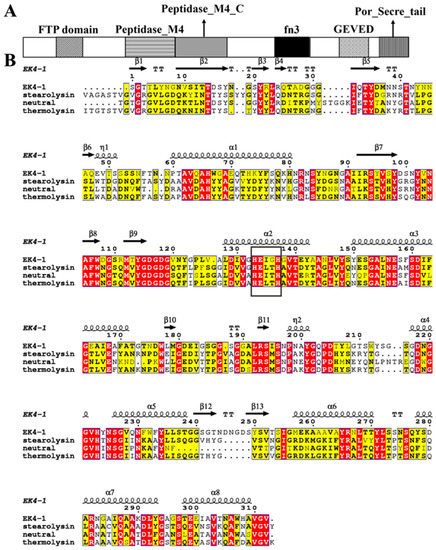 Sequence information of protease EK4-1. (A) The domain of the protease EK4-1. (B) Amino acid sequence homology analysis of EK4-1, Stearolysin, neutral peptidase and thermolysin (Stearolysin: identified from Geobacillus stearothermophilus; neutral peptidase: identified from Thermoactinomyces sp.27; thermolysin: identified from Bacillus thermoproteolyticus). Bold black box indicates conserved HEXXH motif on the second α-helix of the N-terminal domain. Red background indicates highly conserved sequence. Yellow background indicates similarity between groups.