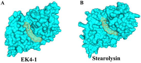 The 3D structure of protease EK4-1. (A) Substrate binding pocket for EK4-1. (B) Substrate binding pocket for Stearolysin.2.4. Analysis of the cleavage sites of protease EK4-1.