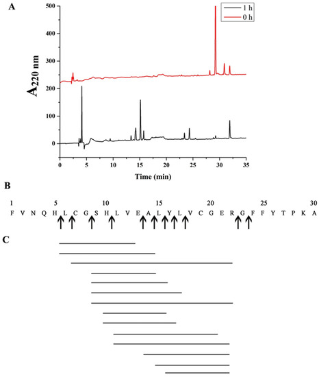 (A) Analysis of insulin box products via HPLC. Hydrolysis conditions were 37 °C, pH 8.0, Tris-HCl buffer. (B) The cleavage site of EK4-1 on the insulin box is represented by arrows. (C) Peptides produced via hydrolysis of insulin box using EK4-1.