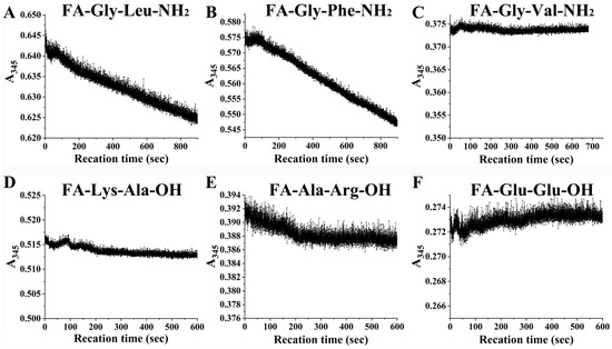 EK4-1 hydrolysis curves for six synthetic dipeptides. Substrates are (A) FA-Gly-Leu-NH2, (B) FA-Gly-Phe-NH2, (C) FA-Gly-Val-NH2, (D) FA-Lys-Ala-OH, (E) FA-Ala-Arg-OH and (F) FA-Glu-Glu-OH.