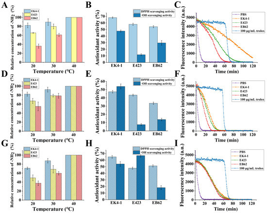 When the substrate was grass carp skin, the peroxide radical scavenging activity in the products of the three proteases EK4-1, E423 and EB62 was 1.16 ± 0.05 mM·TE/g, 0.48 ± 0.03 mM·TE/g and 0.32 ± 0.03 mM·TE/g, respectively (Figure 6C).