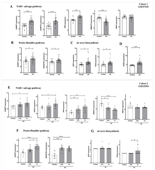 Differential expression profiles of genes encoding key NAD+ metabolic enzymes in AD. Transcriptomic data obtained from two different human AD cohorts, GSE57225 (A–D) and GDS4491 (E–G), from the GEO database. In cohort 1, AD was compared to healthy skin samples (A–D), and in cohort 2, skin with lesional (AL) and non-lesional (ANL) AD was compared to healthy skin samples (E–G). Each point represents one individual and the mean ± SEM for each group is also shown. p values were calculated using unpaired Student’s t-test, one-way ANOVA and Tukey’s multiple range, as appropriate. * p ≤ 0.05, ** p ≤ 0.01, *** p ≤ 0.001, **** p ≤ 0.0001.