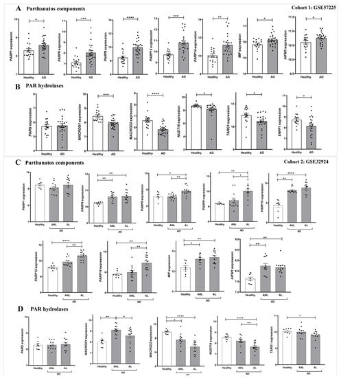 Differential expression profiles of genes encoding parthanatos components in AD. Transcriptomic data obtained from two different human AD cohorts, GSE57225 (A,B) and GDS4491 (C,D), from the GEO database. In cohort 1, AD was compared to healthy skin samples (A,B), and in cohort 2, skin with lesional (AL) and non-lesional (ANL) AD was compared to healthy skin samples (C,D). Each point represents one individual and the mean ± SEM for each group is also shown. p values were calculated using unpaired Student’s t-test, one-way ANOVA and Tukey’s multiple range, as appropriate. * p ≤ 0.05, ** p ≤ 0.01, *** p ≤ 0.001, **** p ≤ 0.0001.