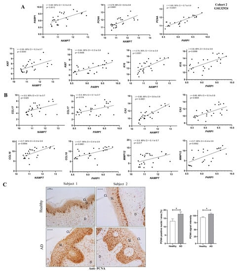 Since the highest differential expression of NAD+ and PAR metabolic pathways was found in AL compared to ANL (Figure 2E–G and Figure 3C,D), we also tested whether there might be a correlation between these alterations and AD lesional status. First, we observed a strong positive correlation between the transcript levels of NAMPT and PARP1 genes using the GEO cohort 2 database (Figure 4A). Next, we correlated NAMPT and PARP1 transcript levels with biomarkers of epidermal hyperplasia (K16, Ki67 and PCNA) (Figure 4A), type 2 inflammation (CCL17, CCL18) and other inflammatory biomarkers (MMP9 and CA2) (Figure 4B) that have already been studied in AL and ANL samples [14,15]. Interestingly, we found a positive correlation between NAMPT and PARP1 transcript levels and those of the different inflammatory and proliferative biomarkers assessed (Figure 4A,B). In concordance, the immunohistochemical analysis of AD patients showed that patients with elevated NAMPT and PAR levels (Figure 1) also had an elevated signal of the proliferation marker PCNA in the basal and spinous layer (Figure 4C). Notably, double immunofluorescence analysis revealed that most NAMPT+ cells were in the spinous layer, while most PCNA+ cells were found in the basal layer. In addition, the morphological analysis confirmed that there was not statistically significant colocalization (Supplementary Figure S3).
