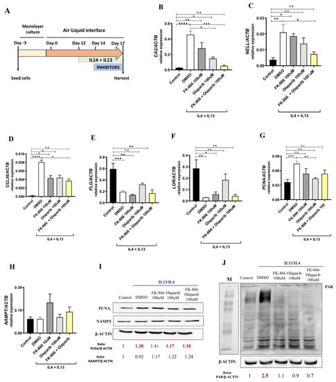 Insert transwells (Merck, Rahway, NJ, USA, MCHT12H48) were seeded with 200,000 human foreskin keratinocytes (Ker-CT, ATCC CRL-4048) on the transwells in 300 μL CnT-PR medium (CellnTec) in a 12-well format. After 48 h, the cultures were switched to CnT-PR-3D medium (CELLnTEC, Bern, Switzerland) for 24 h and then cultured in the air–liquid interface for 17 days. From day 12 to 17 of the air–liquid interphase culture, Th2 cytokines IL13 (10 ng/mL) and IL4 (10 ng/mL) (PeproTech, London, UK) were added [32]. Pharmacological treatments were applied from day 14 to 17 and consisted of 100 μM Olaparib, 100 μM FK-866 or their combination. The culture medium was refreshed every 2 days. On day 17, tissues were harvested for protein and gene expression analysis.