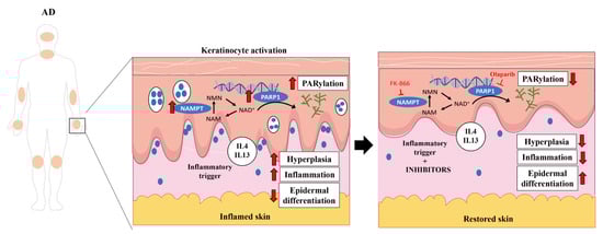 We have shown that NAD+ and PAR metabolism are involved in the pathogenesis of AD. PARP1 hyperactivation in keratinocytes, likely fueled by NAD+ derived from NAMPT, exacerbates AD inflammation and hyperplasia. Accordingly, the pharmacological inhibition of NAMPT and PARP1 decreases disease-associated inflammation and proliferation, restoring skin homeostasis. Taken together, as we have previously described in other inflammatory skin disorders, such as PS, our results point to these drugs as potential novel therapeutic targets to treat this disease.