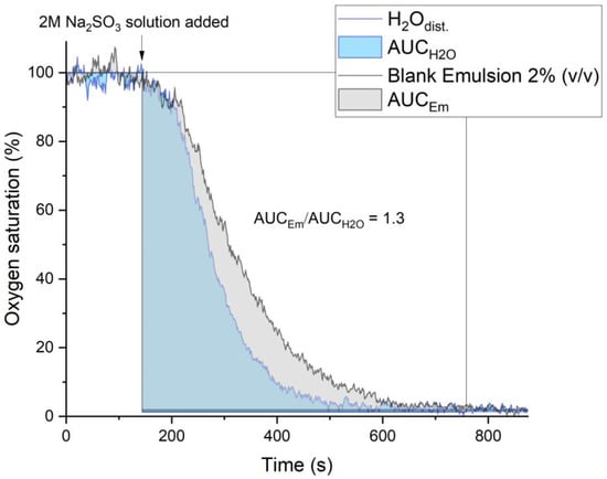 Oxygen content in the aqueous medium in the absence or presence of 2% (v/v) blank emulsion was analyzed by optical oximetry on an Expert-009 analyzer (Econix-Expert, Moscow, Russia) [33,58]. The method determines the phase shift ϕ between the modulated excitation light (525 nm) and the received phosphorescence signal, which is converted into the excited state decay time τ according to the equation:
