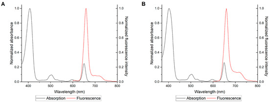 Normalized absorption and fluorescence spectra for 3b in (A) DMF and (B) PFC-NE.