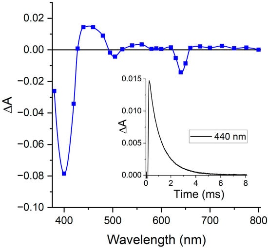 Flash photolysis experiments were performed to investigate the triplet states of 3a–c. Transient absorption spectra were recorded in DMF (Figure 4, Figures S8 and S9 in Supplementary Materials).