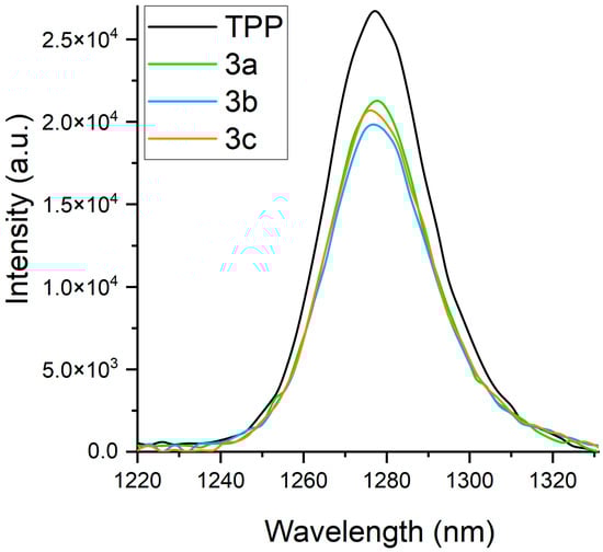 Spectra of singlet oxygen luminescence for 3a–c and TPP. Excitation at 507 nm. Solvent, DMF.