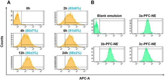 FC-PFC-NE accumulation in HCT116 cells determined by flow cytometry. (A), Time course of cell-associated fluorescence after loading with 3b-PFC-NE. Percentages of positive (drug accumulated) cells are given in parentheses as mean ± SD. (B), 3a-c-PFC-NE uptake at 24 h. Shown are representative experiments (n = 3).