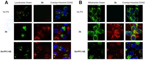 Distribution of 3b and 3b-PFC-NE (10 μM chlorin each) in HCT116 cells. (A), Colocalization with LysoTracker Green, (B), Colocalization with MitoTracker Green. Cells were loaded with the indicated compounds for 24 h, washed, stained with intracellular dyes and analyzed by confocal laser scanning microscopy. Fluorescence signals: green—Lyso- or MitoTracker Green, red—3b, blue—Hoechst 33342. Bar, 5 μm.
