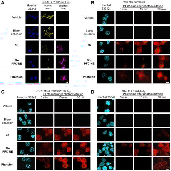 Propidium iodide (PI), a marker of the plasma membrane integrity [45,46], was added to the culture medium prior to illumination. As shown in Figure 8B, nuclear fluorescence of this DNA intercalator was readily detectable within the initial minutes post illumination. These data indicated the necrotic mode of cell photodamage [21,24]. To investigate whether 3b and 3b-PFC-NE retain the ability to trigger photonecrosis under hypoxic conditions, HCT116 cells were cultured in hypoxia for 8 weeks (prolonged hypoxia) followed by illumination in air for the analysis of the death mechanism as described above for normoxia. Alternatively, HCT116 cells were treated with 2 mM sodium sulfite to induce acute hypoxia and illuminated in the presence of this agent. Similarly to normoxia, we registered rapid PI entry upon cell illumination after prolonged hypoxia (Figure 8B): by 5–10 min the nuclei demonstrated PI-associated fluorescence. However, after the photoexcitation of cells in the presence of sodium sulfite, PI fluorescence was detectable within 5–15 min only in samples with 3b-PFC-NE, whereas the emulsion-free 3b evoked little or no effect. In hypoxic cells (sodium sulfite) illuminated in the presence of the reference PS Photolon, a weak cytoplasmic (RNA), but not nuclear, staining was detectable as late as 30 min post illumination. However, if cells were exposed to prolonged hypoxia and then illuminated under normoxic conditions (i.e., in air), the PS activity of Photolon was retained (compare the timing of PI fluorescence in Figure 8C,D). In other words, the potency of Photolon strongly depended on oxygen content, whereas the photoactivation of the oxygen-enriched 3b-PFC-NE was similarly cytocidal in normoxia and hypoxia. Overall, FC-PFC-NE formulations emerge as particularly applicable PSs for lethal damage of hypoxic cells via rapid photonecrosis.