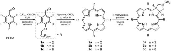To obtain PSs for hypoxia, we decorated the periphery of the chlorin macrocycle with perfluoralkyl fragments. In preliminary experiments, we found that four fragments were minimally sufficient for the solubility in hydrophobic solvents (not shown). Linear perfluoralkyl fragments of different lengths (C2, C4 and C6) were used to compare the solubility of target compounds in perfluorodecalin (PFD), the main component of fluorocarbon emulsions. Compounds 3a–c were prepared in three steps from commercially available reagents (Scheme 1). PFC fragments from fluorine-containing alcohols CnF2n+1CH2OH were introduced into the chlorin macrocycle at the first step by the nucleophilic substitution of the para-fluorine atom of pentafluorobenzaldehyde (PFBA).