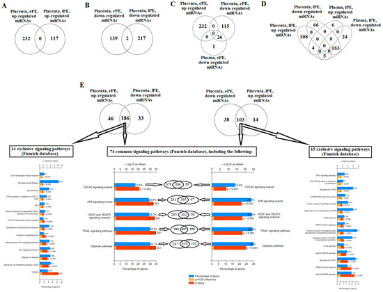 Comparison of differentially expressed miRNAs in the placenta and blood plasma of pregnant women with ePE and lPE at the time of delivery via the plotting of Venn–Euler diagrams and the analysis of the signaling pathways regulated by them in the Funrich program. (A) Search for intersection of lists of significantly up-regulated miRNAs in the placenta of those with ePE and lPE. (B) Search for intersection of lists of significantly down-regulated miRNAs in the placenta of those with ePE and lPE. (C) Search for intersections of lists of differentially expressed miRNAs in the placenta and blood plasma of women with ePE. (D) Search for intersections of lists of differentially expressed miRNAs in the placenta and blood plasma of women with lPE. (E) Signaling pathways regulated by the miRNAs with multidirectional changes in the expression levels of placental tissue in those with ePE and lPE.